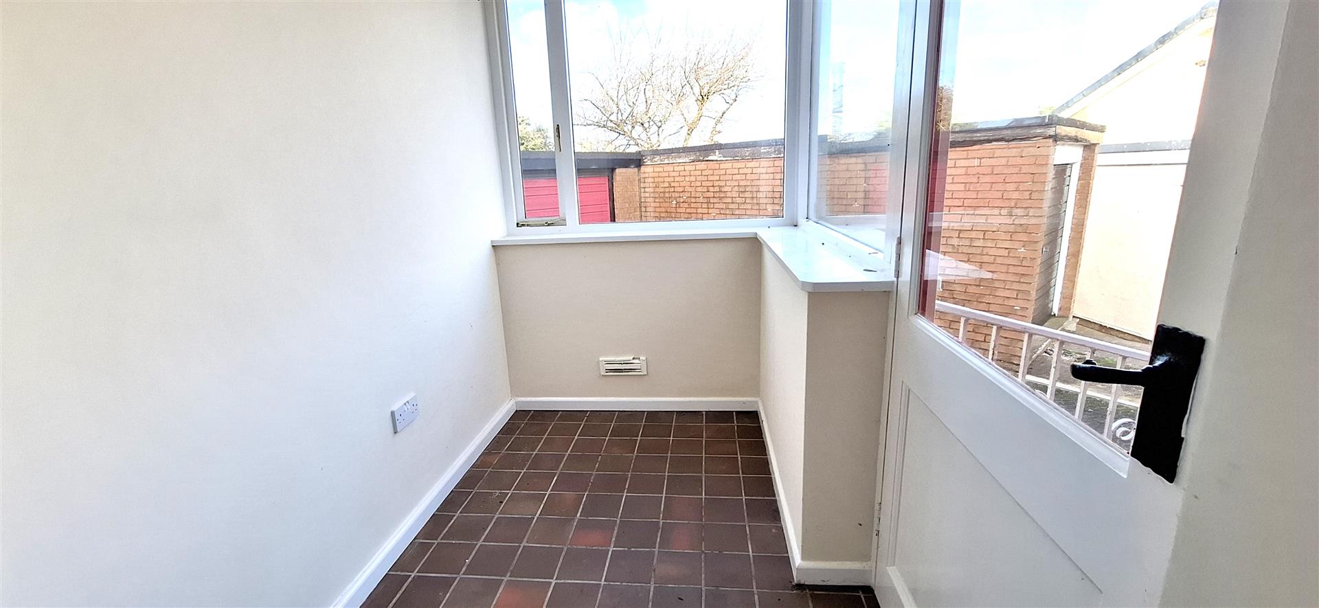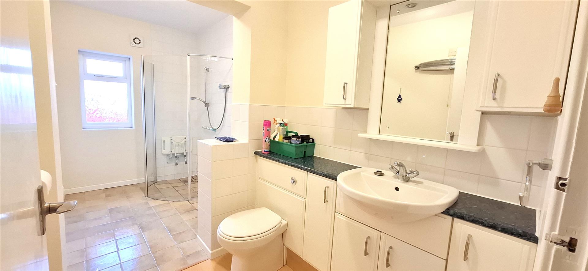 Walk-in shower enclosure, was hand basin with vanity storage, low flush wc, tiled and laminate flooring, UPVC double glazed window to side elevation, ladder radiator.
