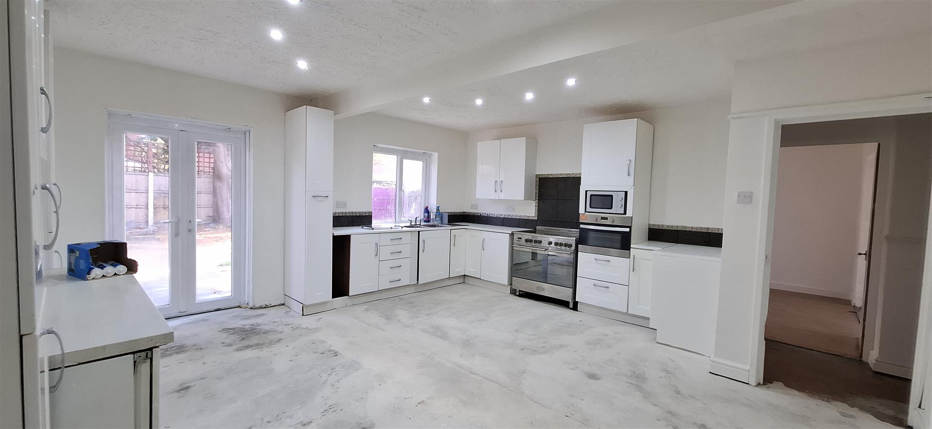 Fitted with a range of base and wall storage units, ample working surfaces, integrated eye level oven, void for cooking range, inset double sink unit, French doors to rear gardens, inset spotlighting.