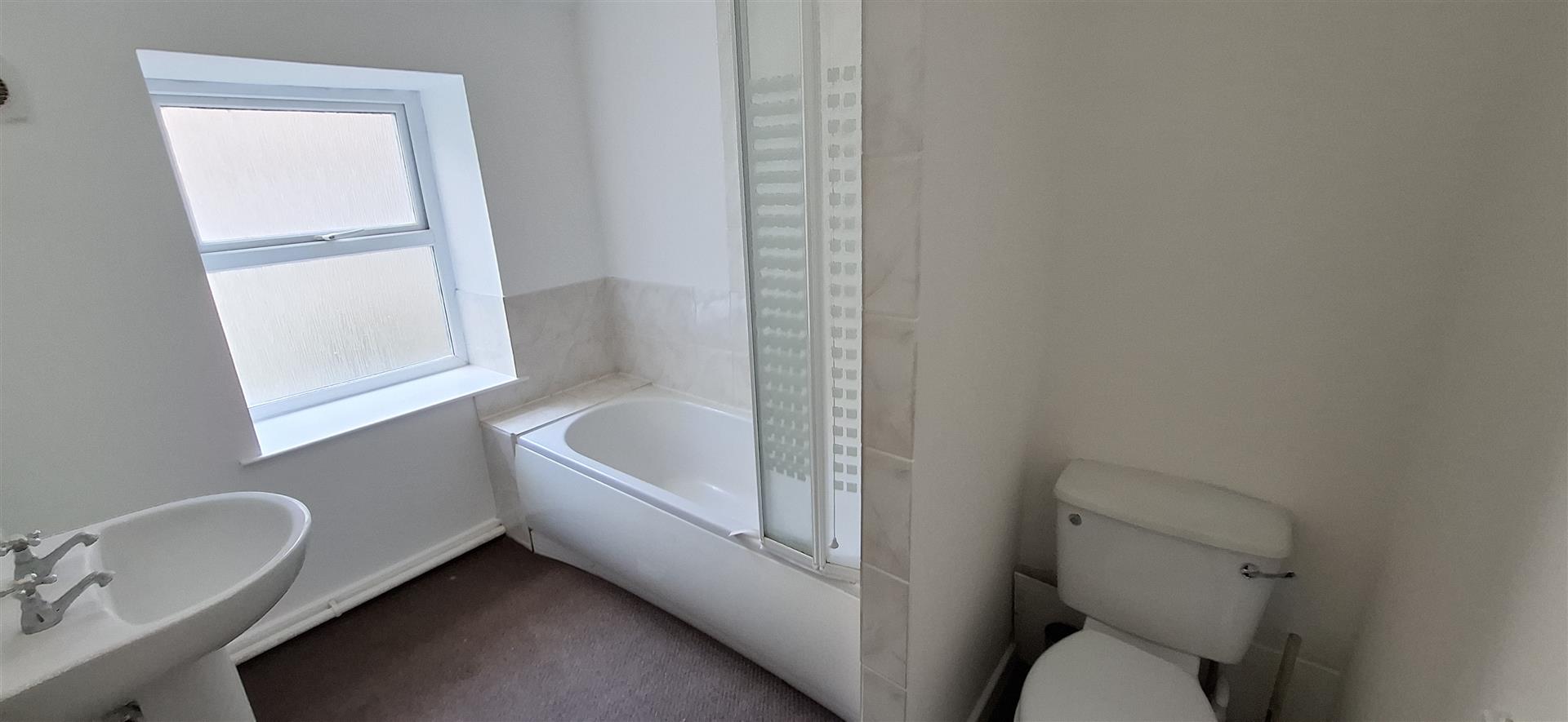 Fitted with a white 3 piece bathroom suite consisting of bath with electric shower over and foldable shower screen, W.C and pedestal wash hand basin. uPVC double glazed window to rear elevation, extractor fan, radiator, tiled splashback