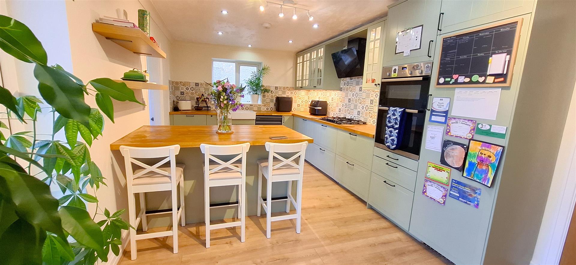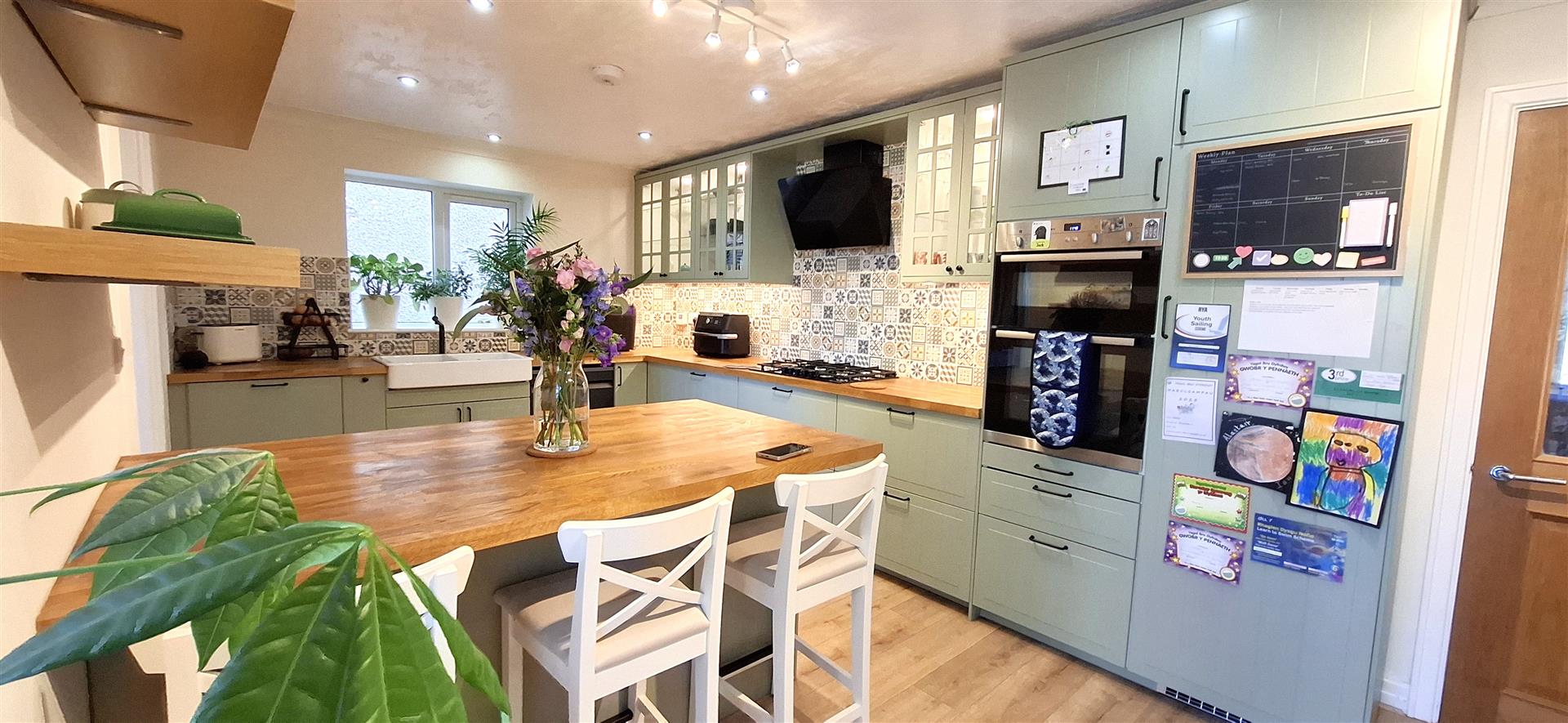 Recently fitted with a contemporary shaker style kitchen comprising ample drawer and cupboard storage units with lighting, coordinating glass fronted illuminated display cabinets, double ceramic sink with mixer tap, integrated electric double oven, 5 ring gas hob with extractor hood over, void and plumbing for dishwasher, integrated fridge, coordinating island with drawer storage and breakfast bar, ample working surfaces and tiled splashbacks, UPVC double glazed French doors to conservatory, UPVC double glazed window to side elevation.