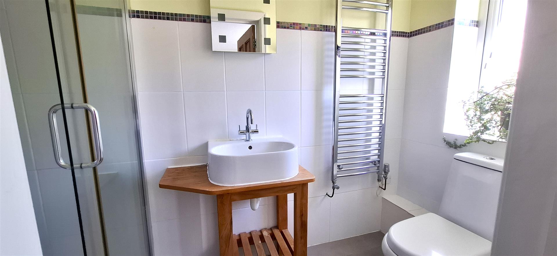 Shower enclosure, wc, wash hand basin on an oak stand, chrome ladder radiator, UPVC window to front elevation, part tiled walls.