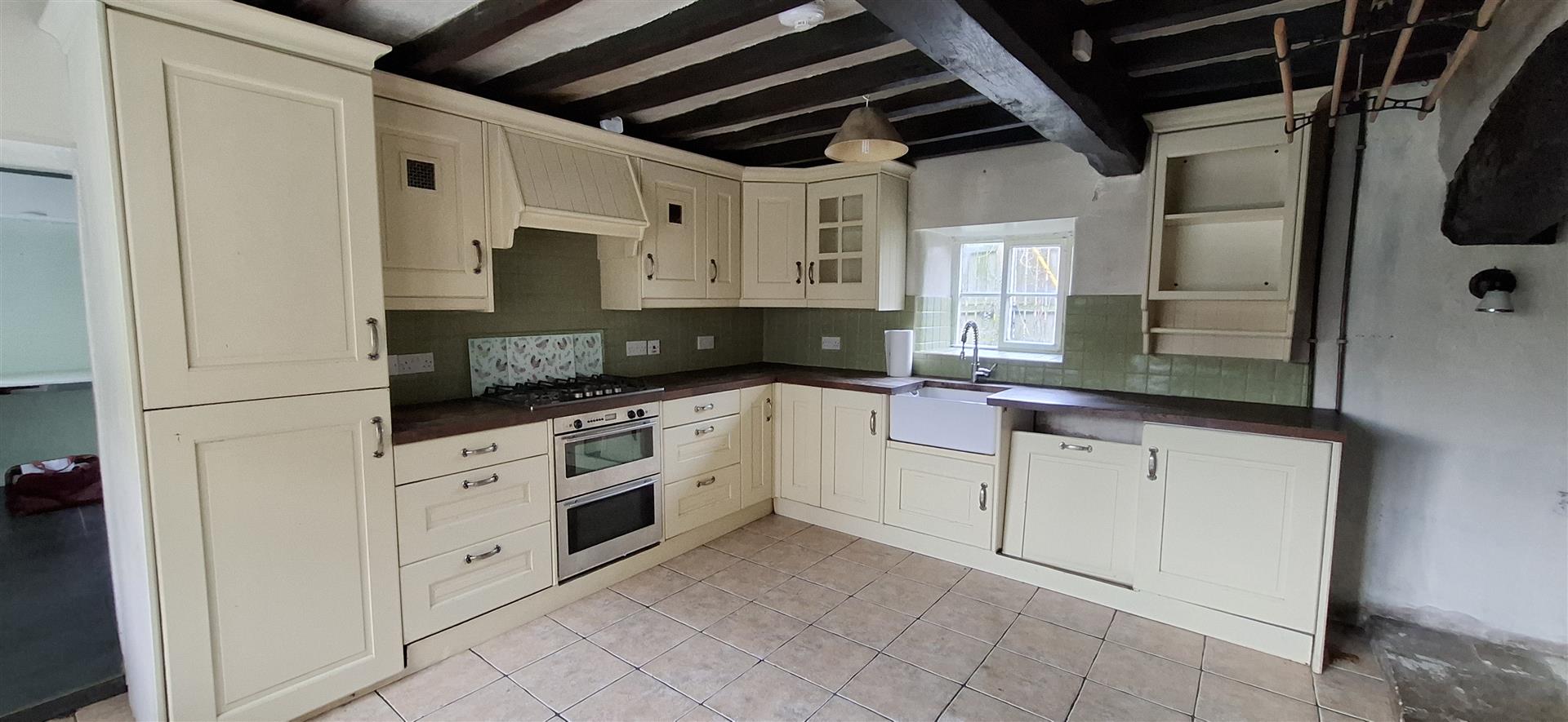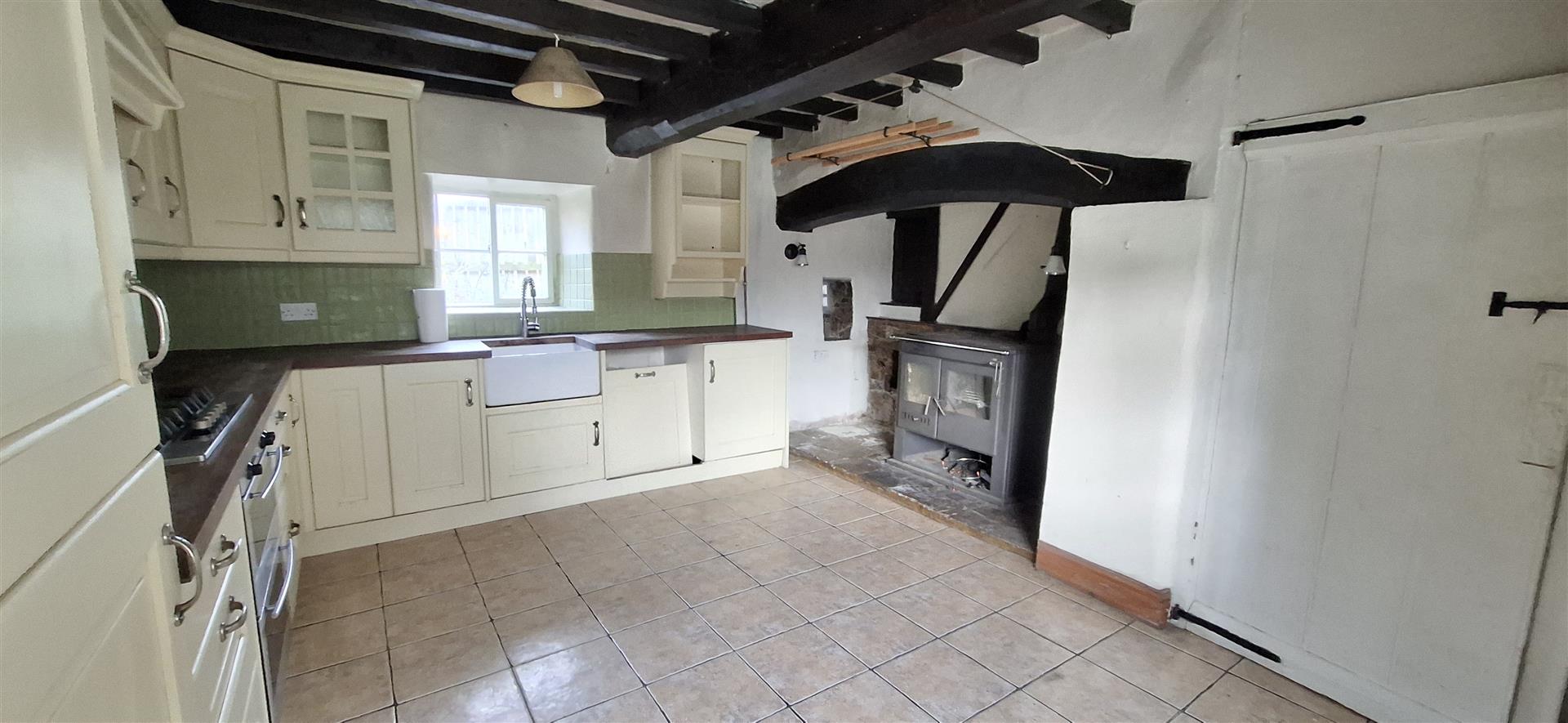 Base and wall storage units, working surfaces with tiled splashback, inset Belfast sink with mixer tap, integrated electric oven with gas hob and extractor hood over, large inglenook housing a solid fuel range, tiled flooring, windows to front and rear, beamed ceiling.