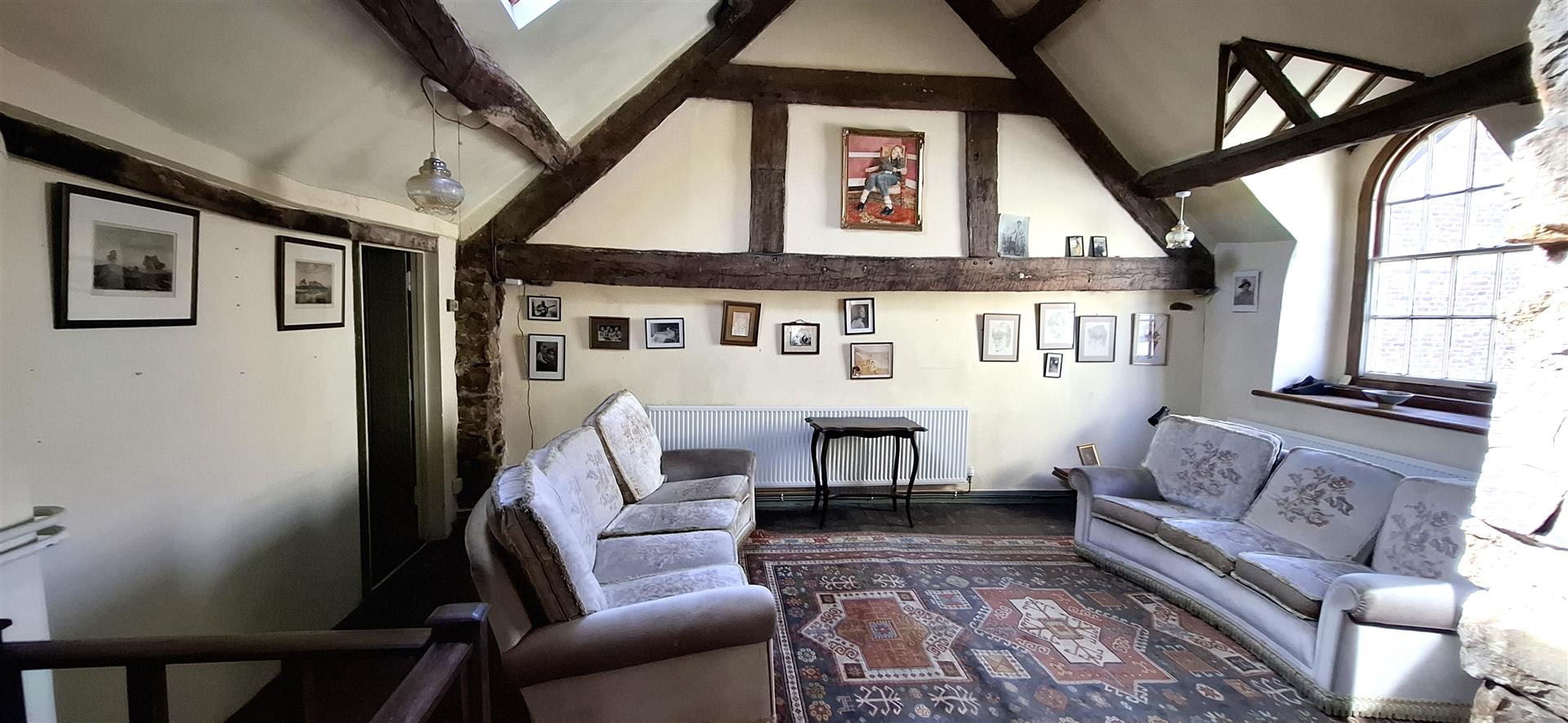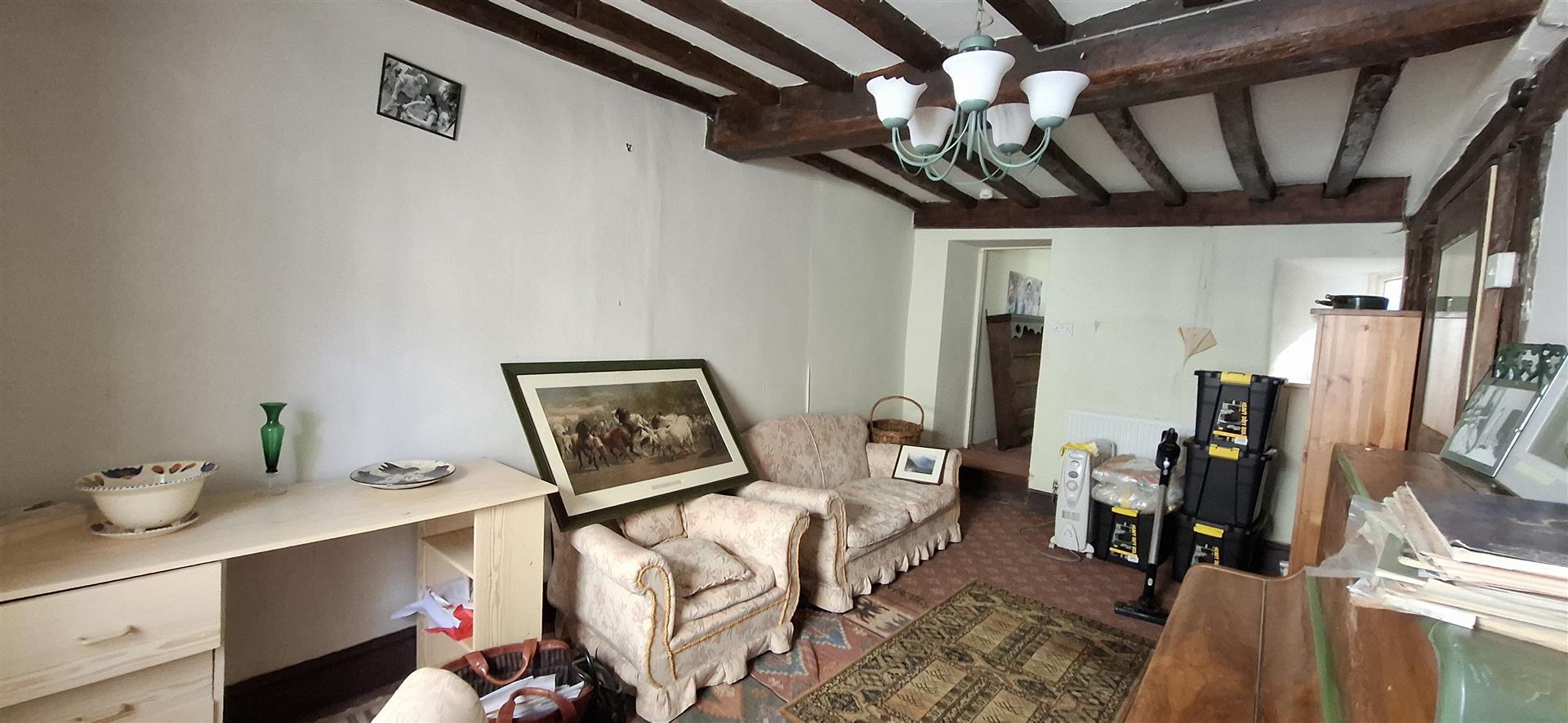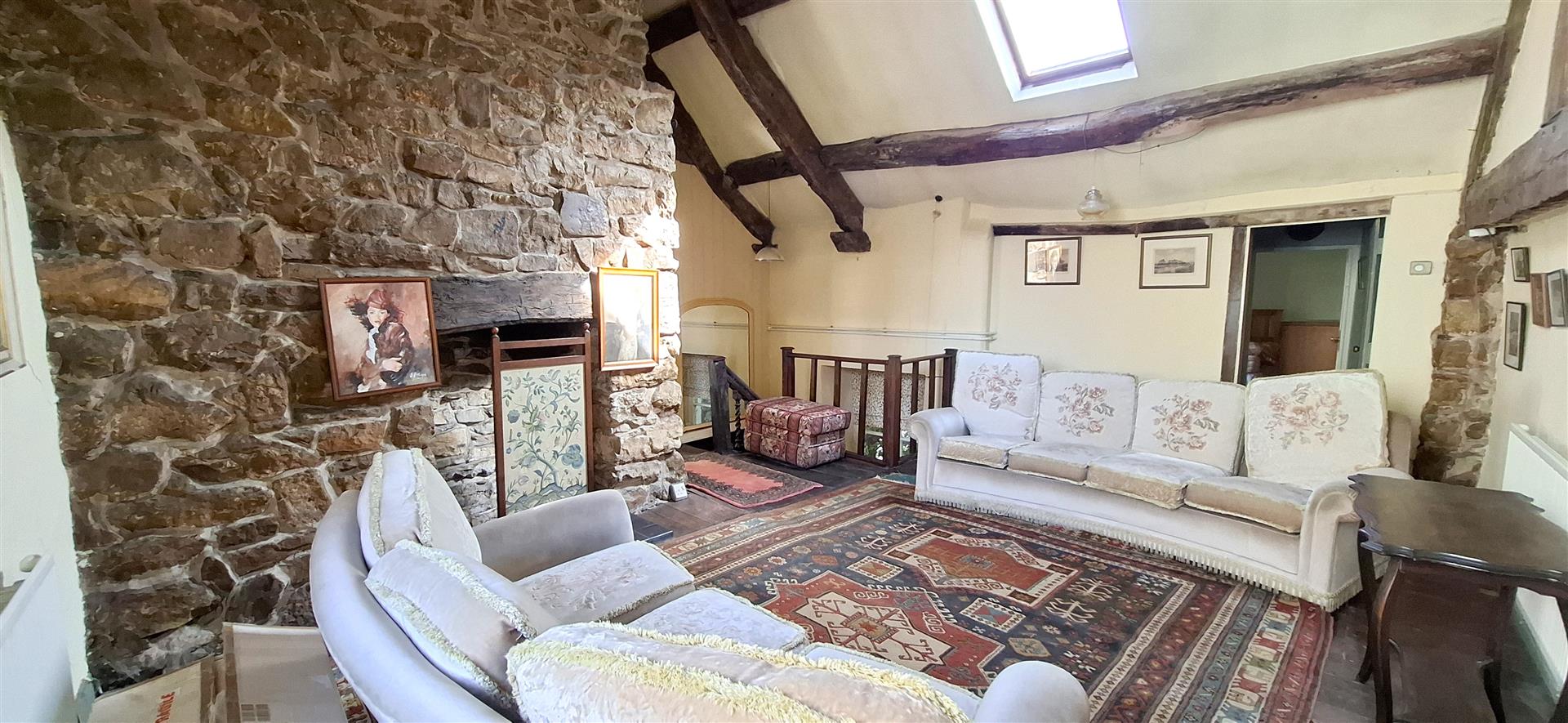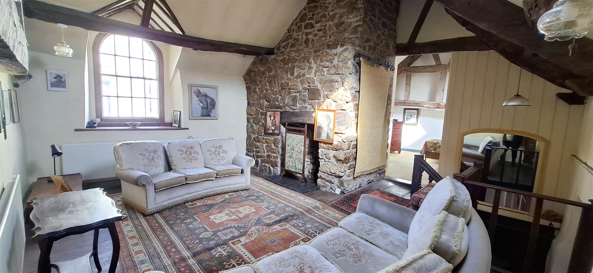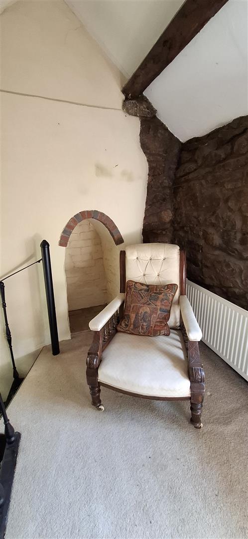With timber flooring, exposed stone walls, inglenook fireplace with heavy timber lintel and tiled hearth. Arched window to front elevation, roof light.