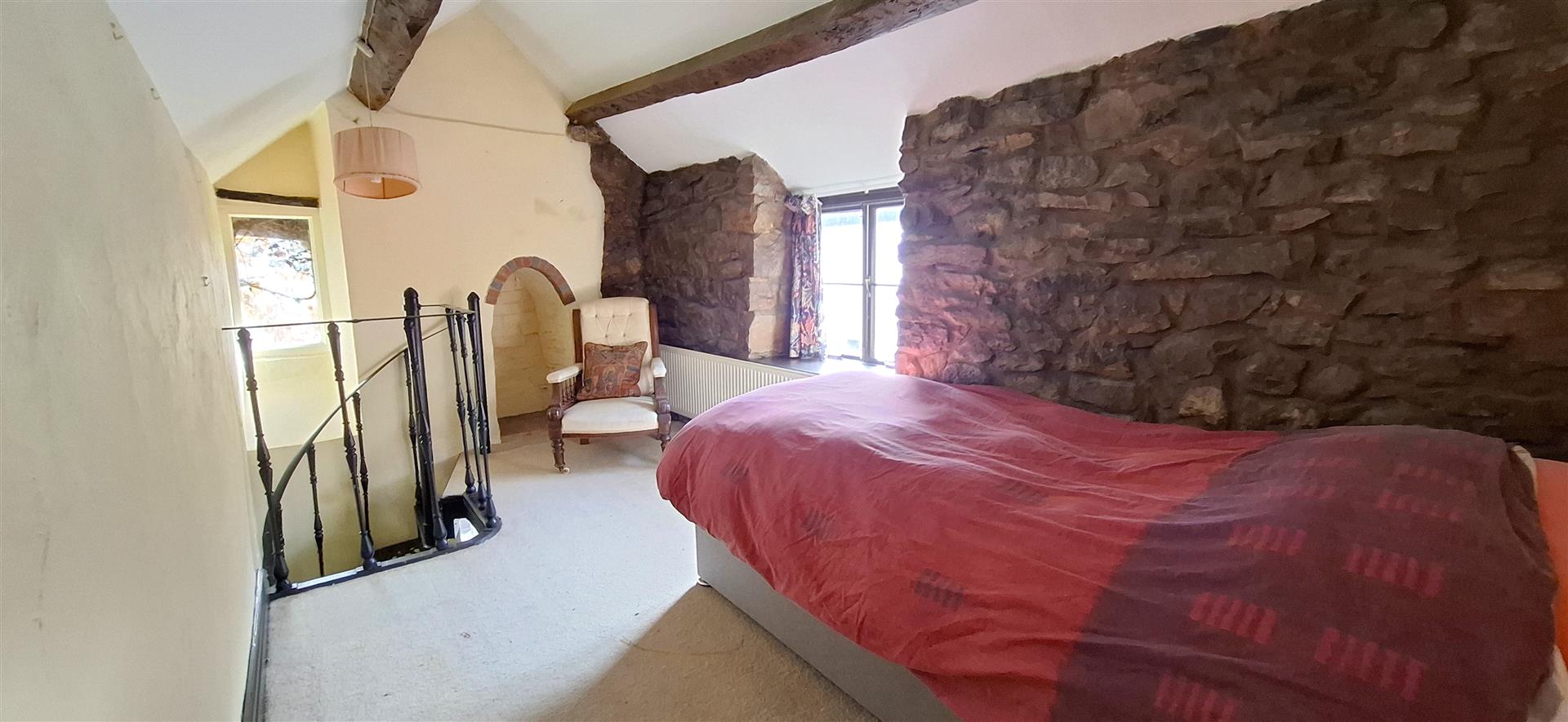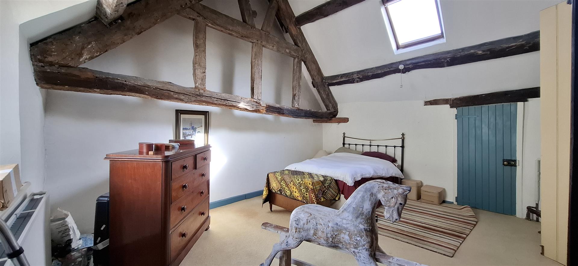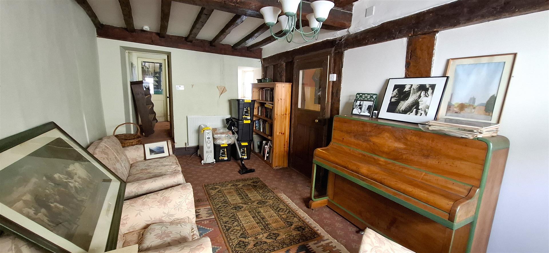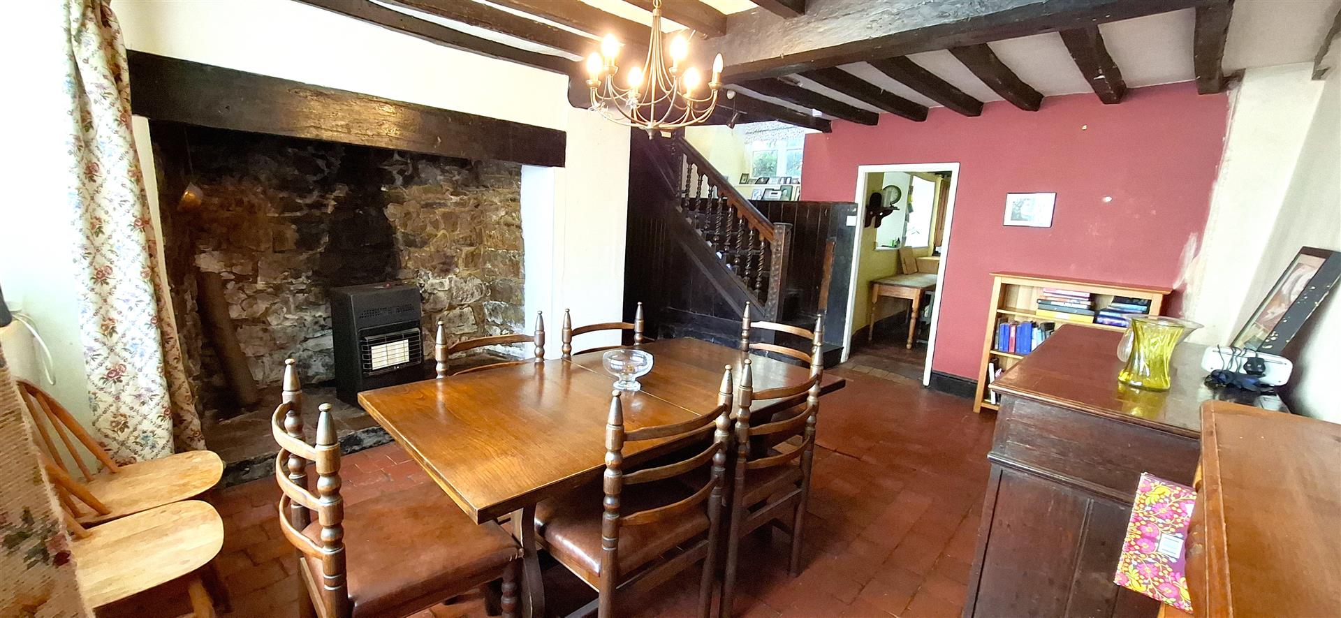 With timber flooring, exposed stone walls, inglenook fireplace with heavy timber lintel and tiled hearth. Arched window to front elevation, roof light.