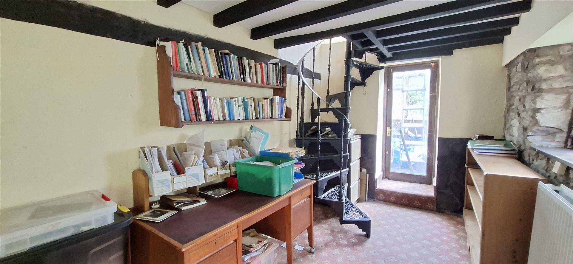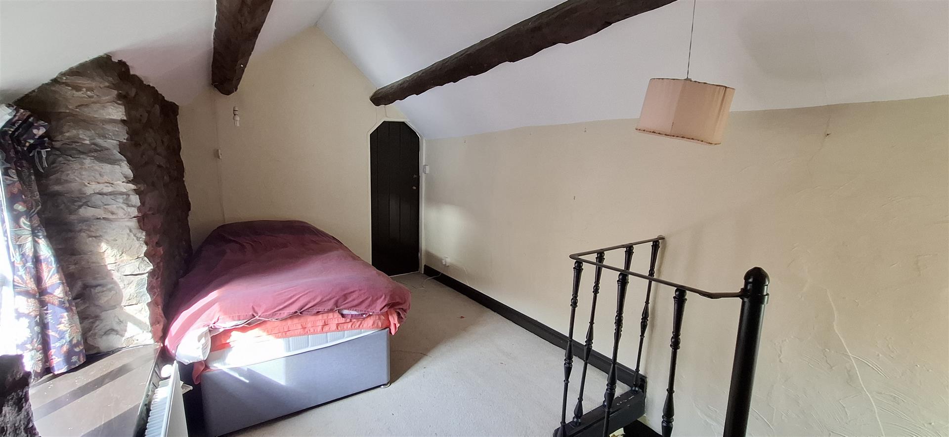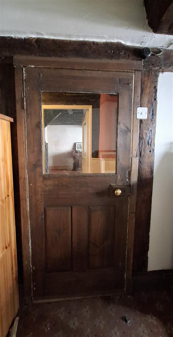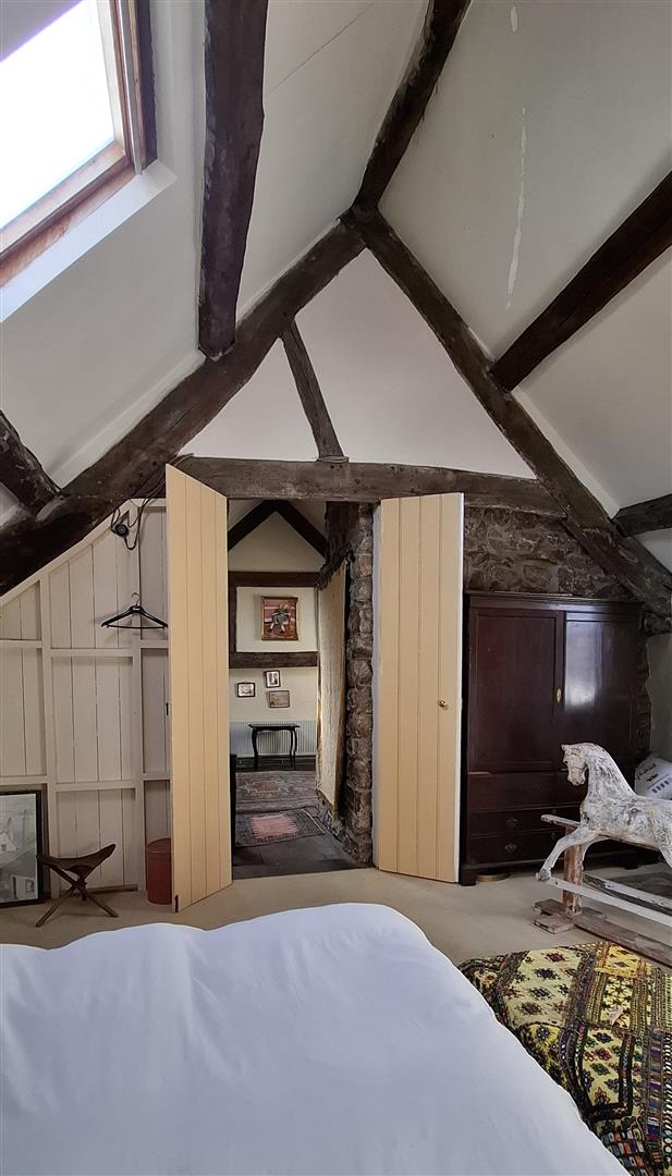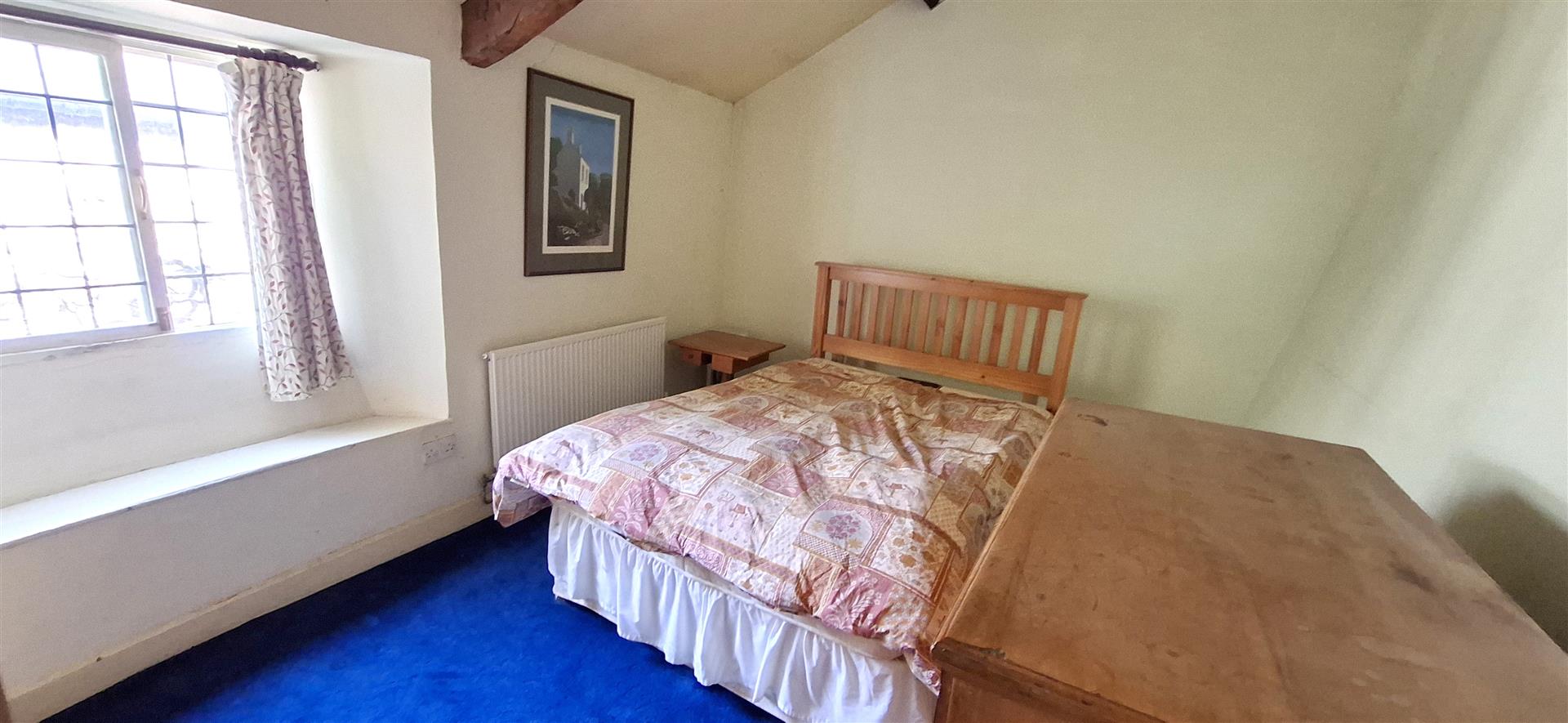 With timber flooring, exposed stone walls, inglenook fireplace with heavy timber lintel and tiled hearth. Arched window to front elevation, roof light.