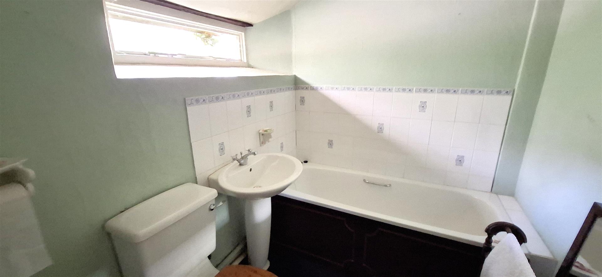 Panelled bath, pedestal wash hand basin and low flush wc, beamed ceiling, window to side elevation.