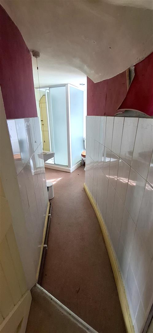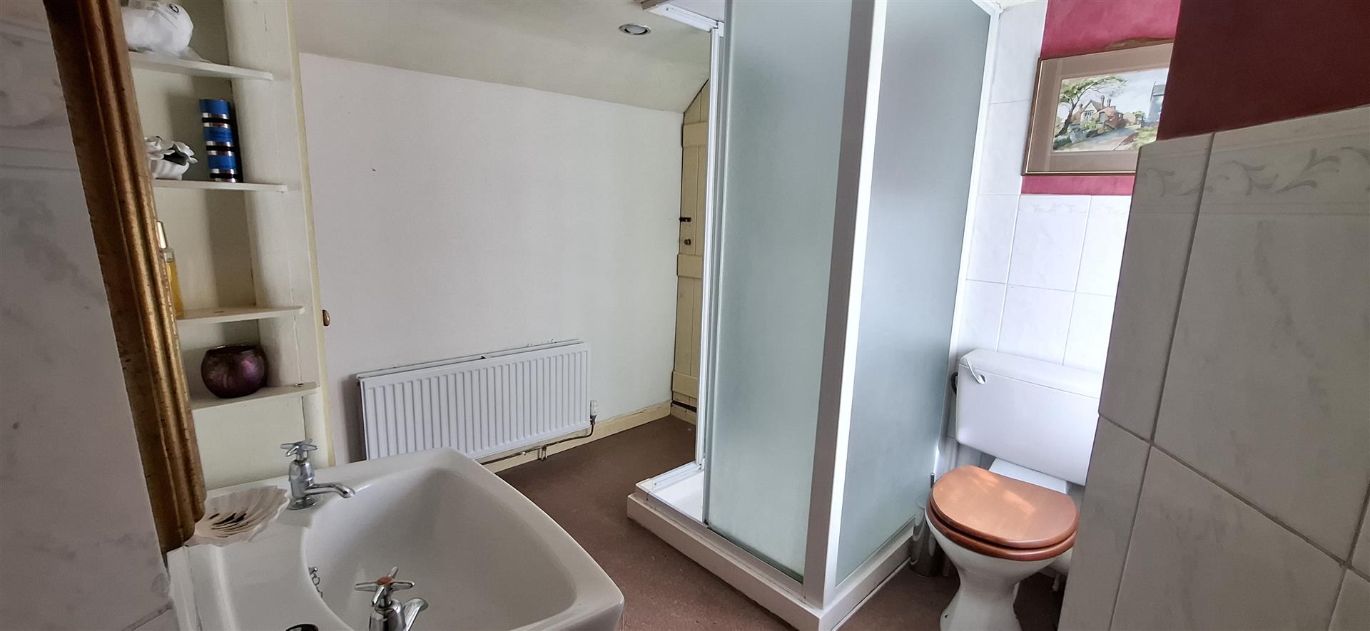 Shower cubicle, pedestal wash hand basin and low flush wc. Built-in storage cupboard, window to side elevation.