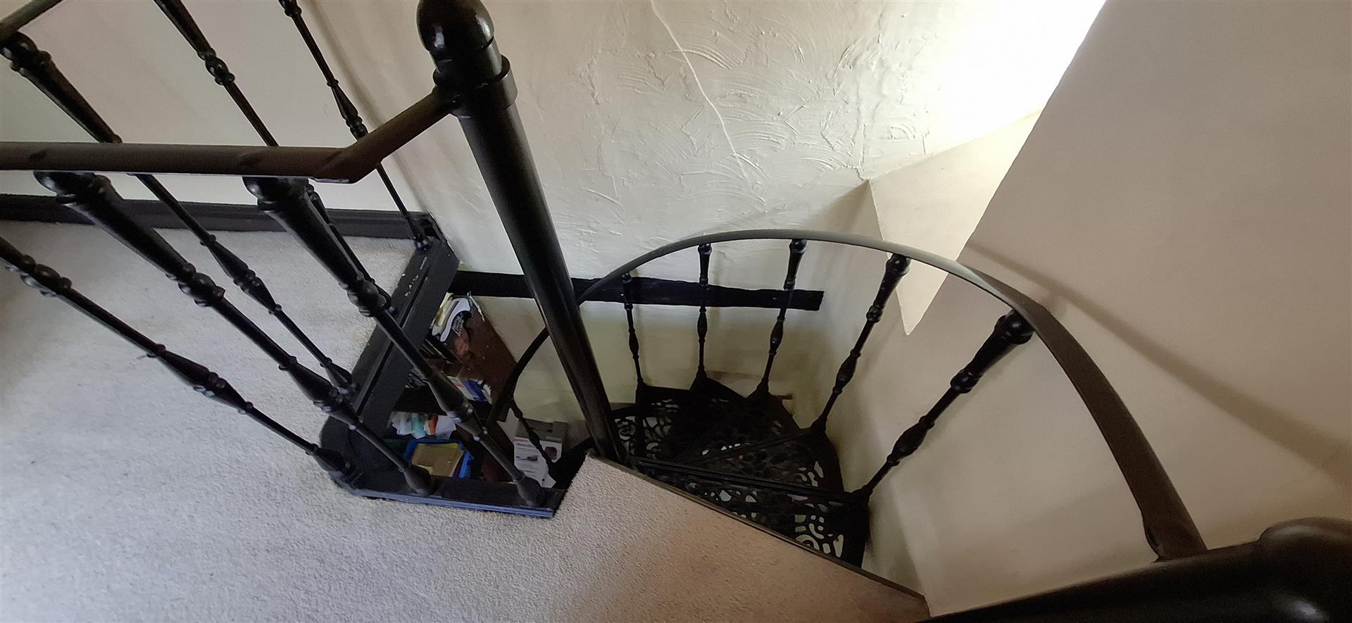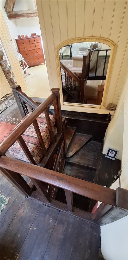 Exposed stone walls, ceiling beams, feature fireplace, spiral staircase leading down to the Snug.