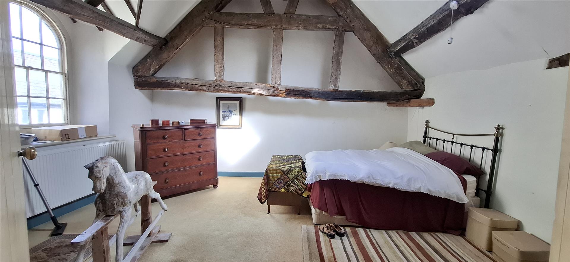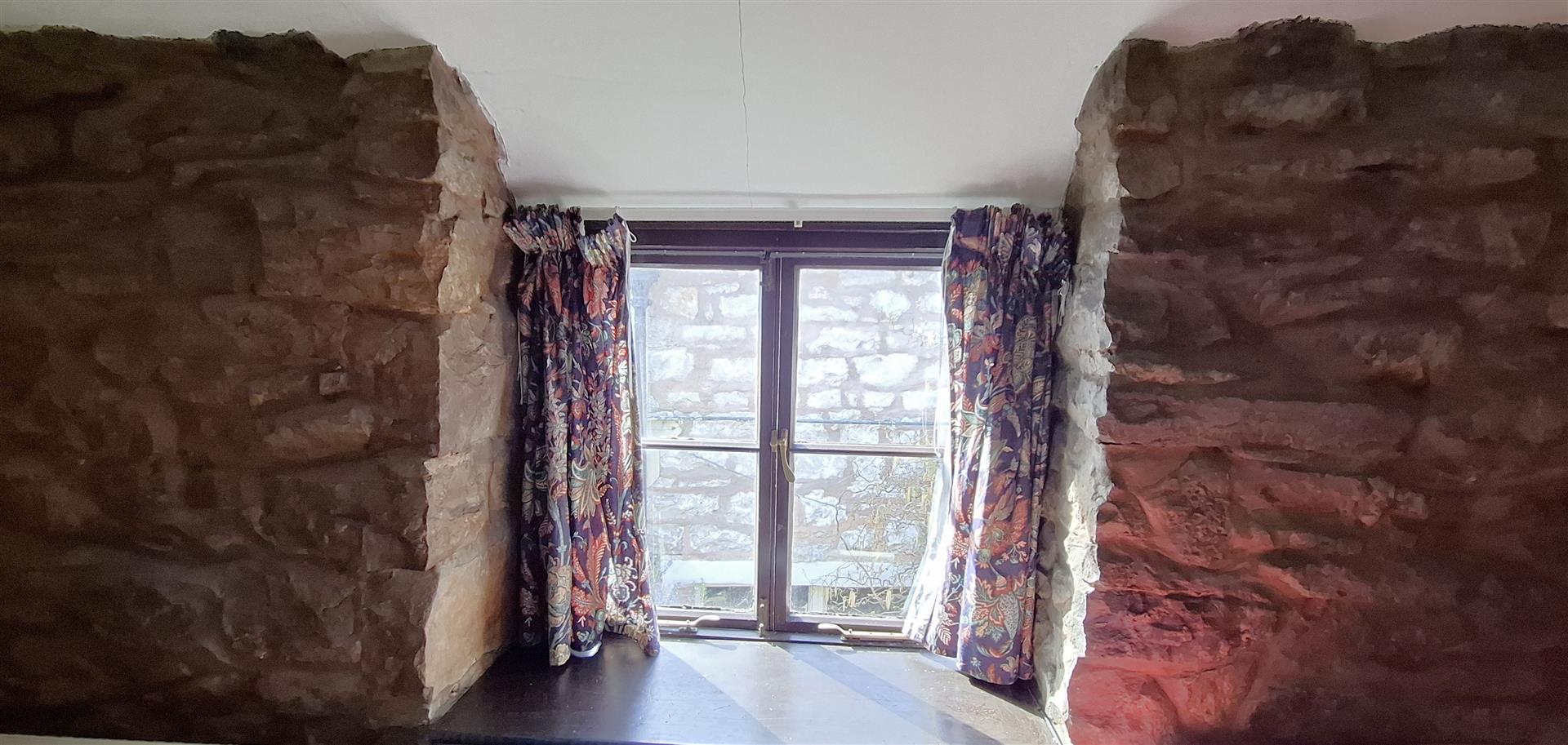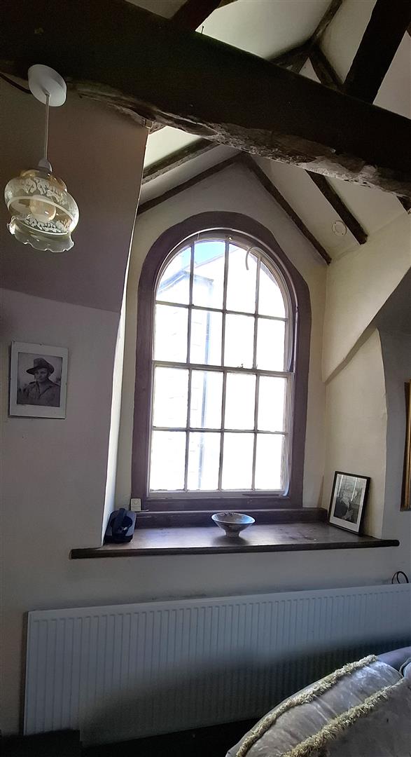 Arched window to front elevation, timber truss and beams, exposed stone walling.