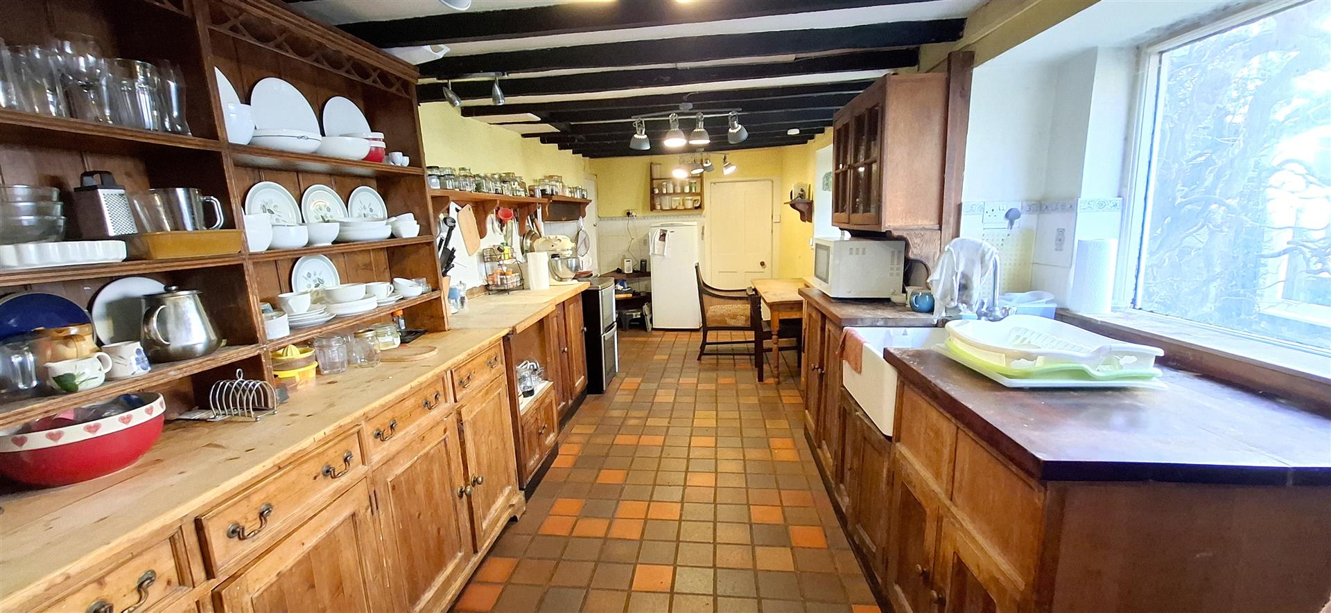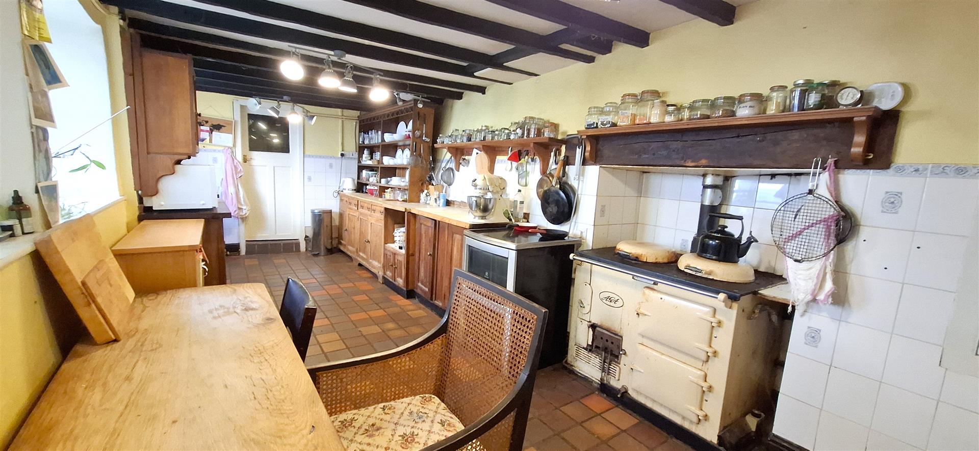 Accessed from the Dining Room. Range of base and wall storage units and shelving, Belfast sink, gas fired Aga range, beamed ceiling, spotlighting, quarry tiled flooring, useful built-in storage cupboard. External door, access to:-