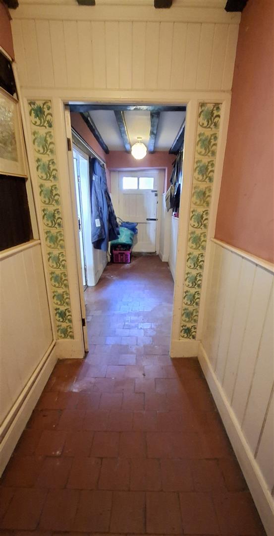 Quarry tiled flooring, beamed ceiling, timber clad walls, electricity meters, timber external door to rear courtyard.