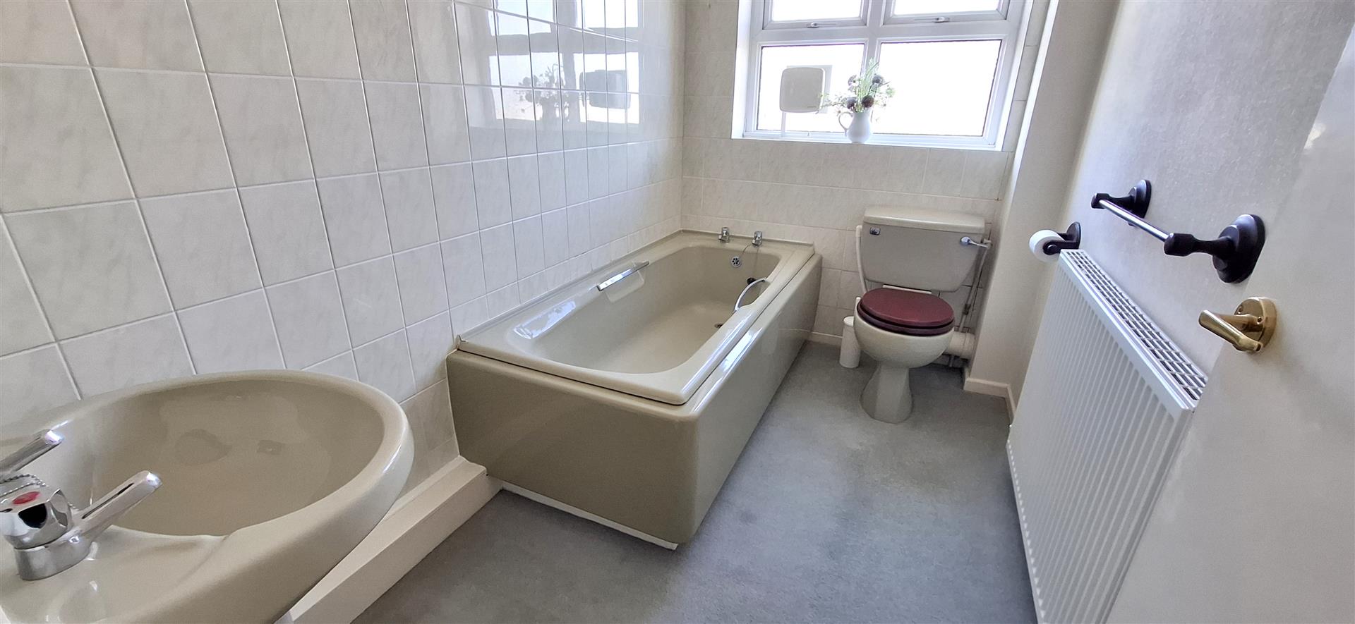 Panelled bath, pedestal wash hand basin, low flush wc, part tiled walls, obscure glazed window to front elevation.