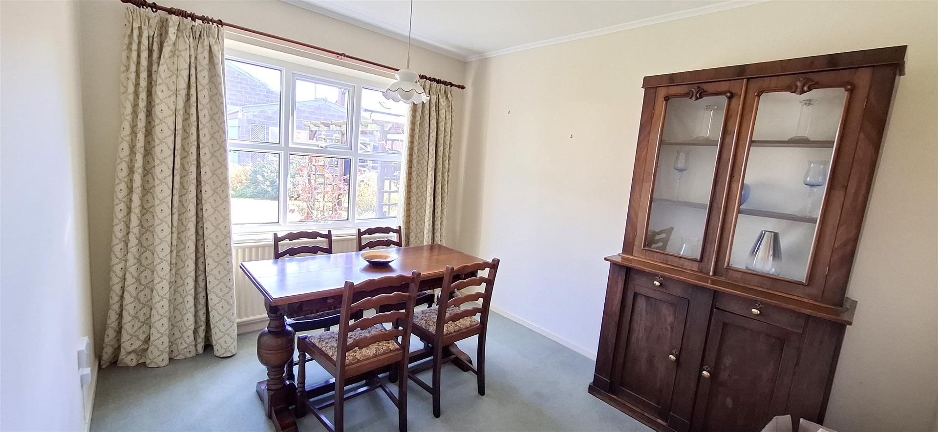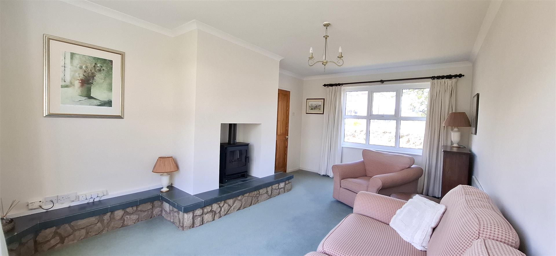 Light and spacious room with windows to front and rear elevations, feature raised fireplace housing an electric stove on a slate hearth. Coved ceiling.
