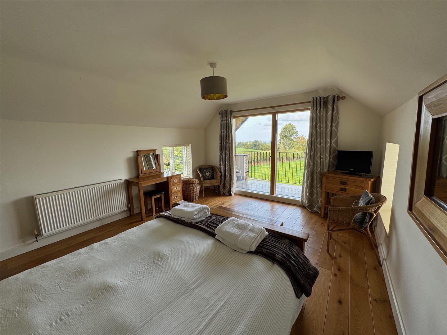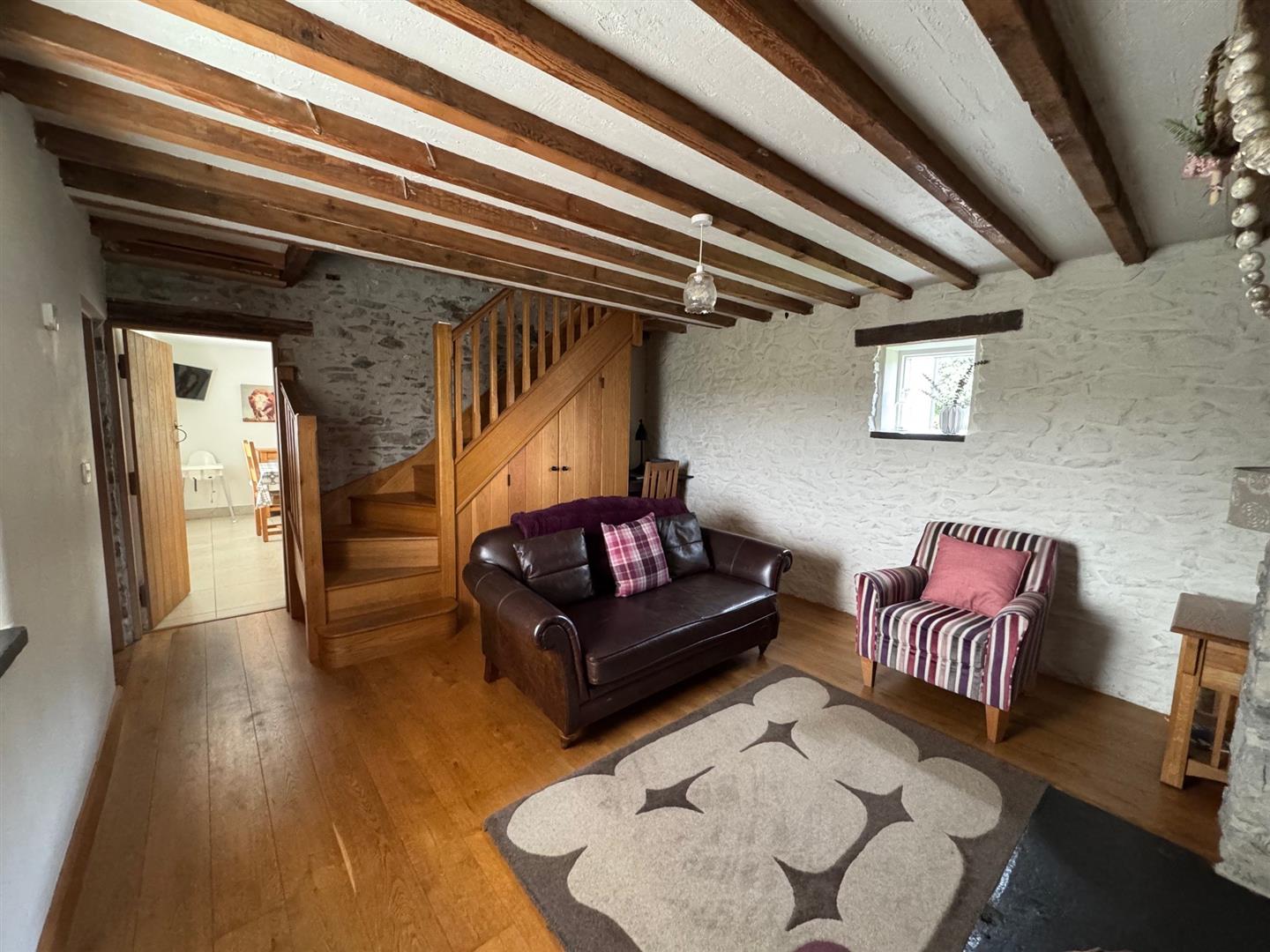 Large room with glass gable end, log burner, continuation of oak floor, windows to all elevations.