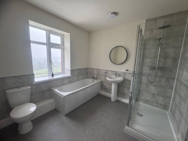 Four piece suite comprising of, walk in shower, bath, low flush WC, pedestal wash hand basin and heated towel rail.