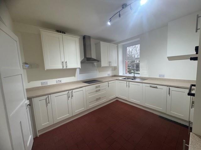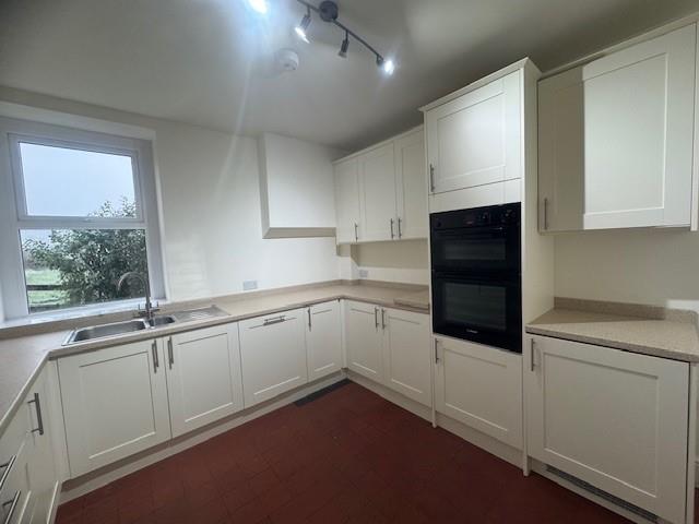 Well appointed kitchen with an good range of base and eye level units, integrated oven, fridge and dish washer, ceramic hob, continuation of the clay tile floor, window to side elevation with stunning views.